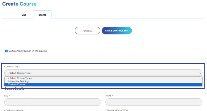 4. To set up the course for an E-Signature the "Course Type" will need to be set to "Custom Course"